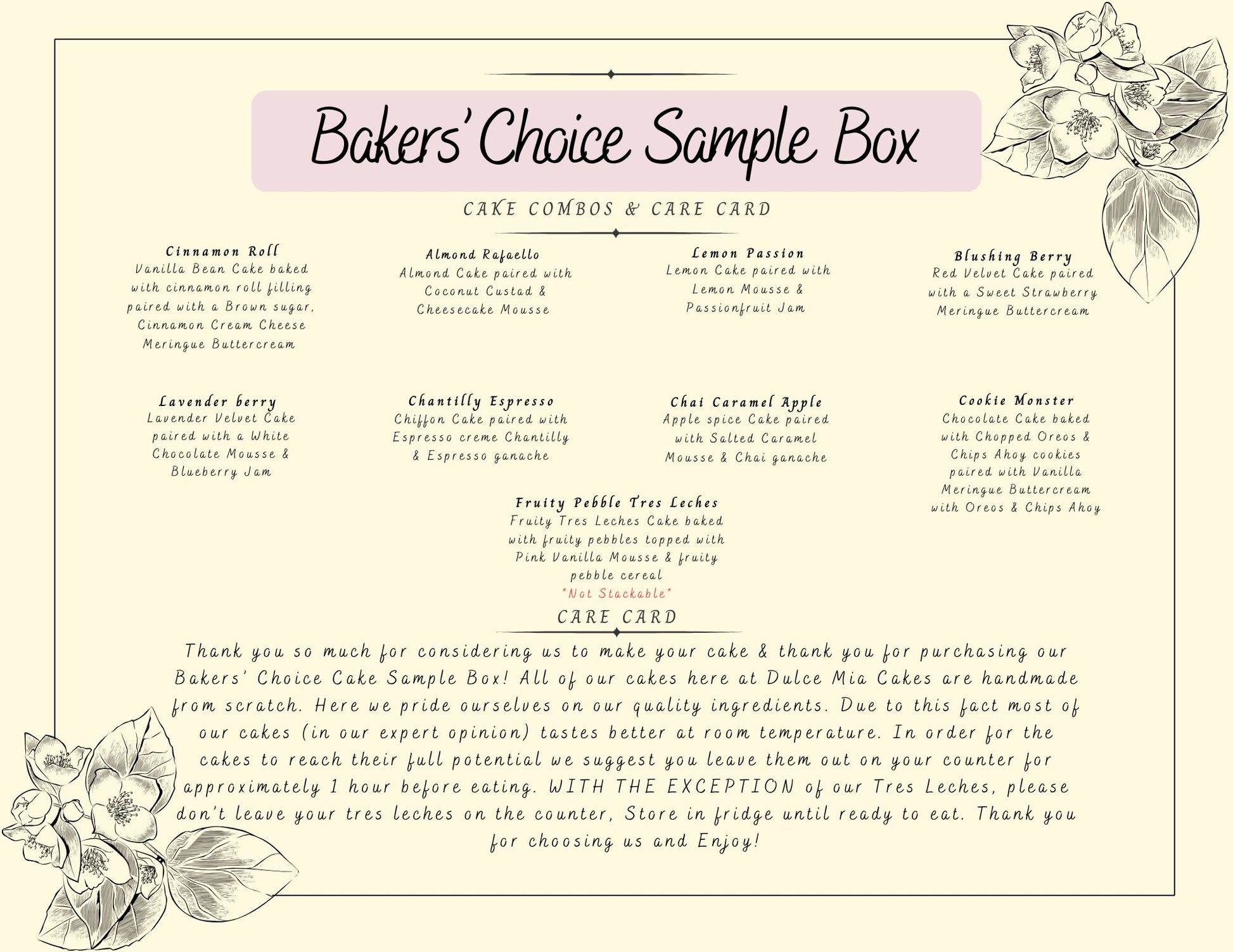Our Sample box for the month of November is available now! The box consists of 6 delicious cake flavors, with each having their own unique filling pair: a great way to get to know our flavors and consistency! Vanilla bean cake with strawberry buttercream, Chocolate cake with ganache & white chocolate mousse, Lavender cake with lemon custard filling, Banana cake with dulce de leche mousse, Chiffon cake with raspberry mousse, & Red Velvet cake with cheesecake mousse.